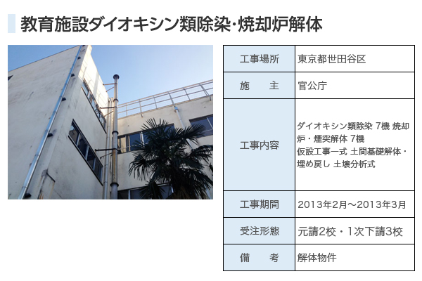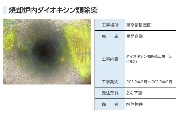 本トリートでは、有害物質の除去に関する特許も保有。解体作業前の空気中ダイオキシン類濃度測定結果や、汚染サンプリングの調査結果に基づき、解体作業管理区域および使用保護具等を剪定し、官公庁への届出から解体工事まで徹底したスケジュールと管理体制で安全な工事を実施しております。